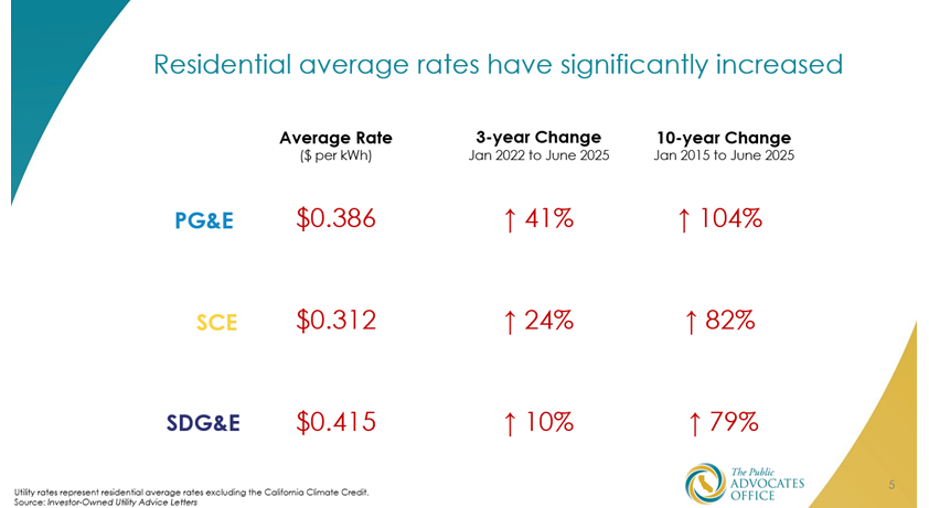 The Public Advocates Office represents utility customers’ interests primarily by participating in proceedings before the California Public Utilities Commission and engaging in other policymaking forums. The California electric utilities recover their operational and investment costs through the rates they charge their customers.  These rates regularly change due to many factors. We track the rates and develop recommendations to minimize costs to ratepayers. This report summarizes residential electric rate changes across Pacific Gas and Electric (PG&E), San Diego Gas & Electric (SDG&E), and Southern California Edison (SCE) service territories through July 1, 2025.
